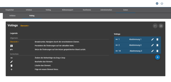 Die Votings können im Voting-Backend von beliebig vielen Moderatoren live bearbeitet und erstellt/aufgerufen werden. Dazu gesellen sich vielfältige Möglichkeiten der Vorschau sowie des Exportes auf die Bühne für den aktuellen Vortragenden / Redner.