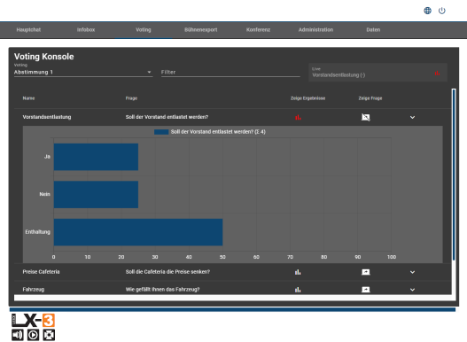 Über ein optionales Live-Voting System sind gezielte und protokollierte Live Umfragen / Abstimmungen mit individuellen Voting Rechten für die einzelnen Nutzer möglich. Dabei ist selbstverständlich auch ein gewichtetes Voting für unterschiedliche Stimmrechtsverteilungen möglich.